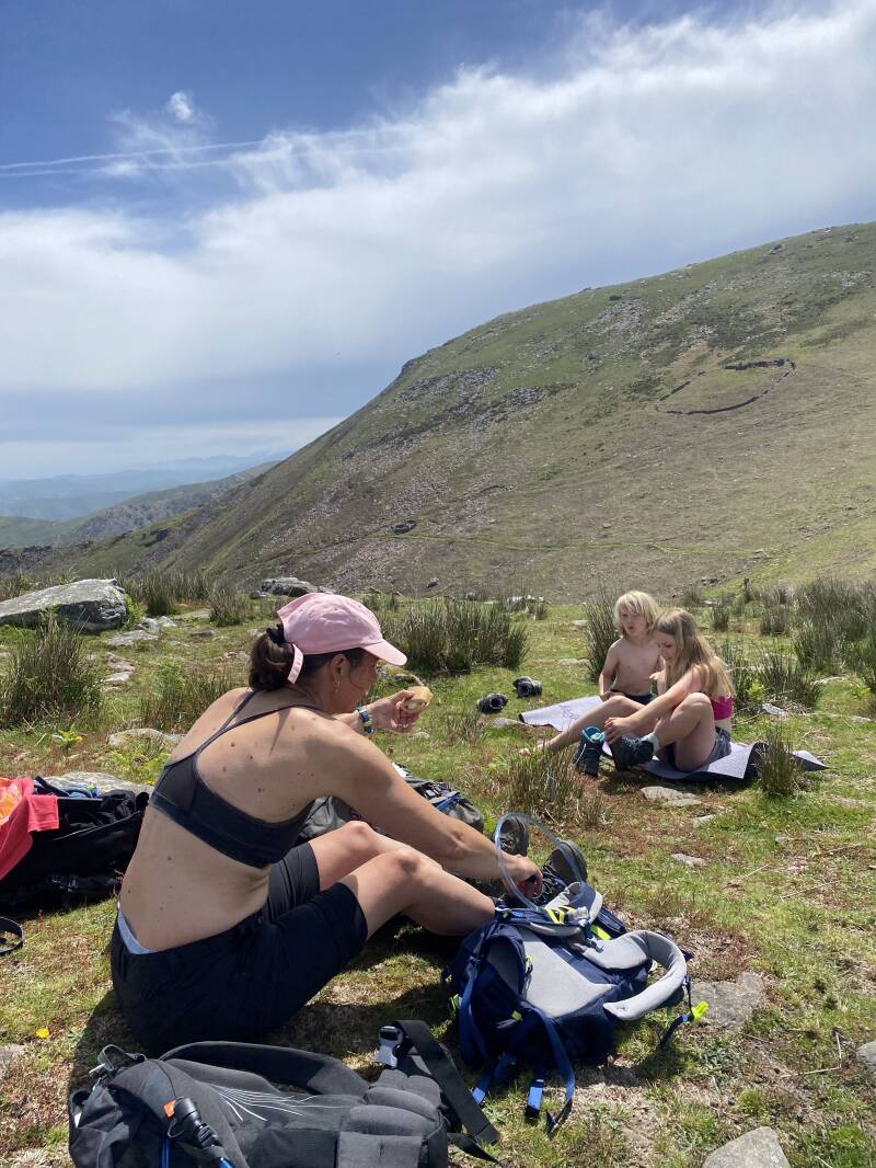 Diep verdriet dat ze haar vriendinnen mist, dat ze geen stokpaard rijdt omdat ze dan bang is haar stokpaard vriendin teveel te missen waar ze elke dag mee reed. Ze wil niet wandelen, ze wil geen Pelgrimstocht doen. Haar hele lijf heeft verdriet en haar boosheid uit zich in de Lego niet willen opruimen. Ik ben bij haar en laat haar snikken en schreeuwen. Het doet pijn om haar verdriet te voelen. Maar ik voel ook dat het goed is dat ze dit uit. En ik weet dat ze zo meteen weer over de camping met haar camping vriendinnetjes huppelt. En.. ik weet dat emoties komen en gaan. Het moet soms donker zijn om ook het licht te kunnen voelen. We lopen vaak weg van het donker, ook van het donker van onze kinderen. Dan hebben we het gevoel dat we iets moeten repareren. Ook mijn gedachten denken: ‘waar zijn we in godsnaam aan begonnen?’ als ze zo’n diep verdriet heeft. Waarom doen we onze kinderen dit aan? Maar net zo goed lopen er twee dagen later ook dikke tranen van geluk over mijn wangen als ik haar op een bergpas met haar rugzak bijna zie zweven omdat ze zo geniet van het wandelen in de bergen. Het is de angst voor het onbekende wat haar zo dwars zit. Ik ben ook bang. Bang dat de kinderen het niet volhouden, dat ze het echt niet leuk vinden, dat we uitgeput raken, dat we huilend op de vloer van een geitenkot liggen en niet meer verder kunnen, het gaat allemaal door mijn hoofd. Maar na drie dagen trainingswandelingetjes kan ik niet geloven wat ik zie. De eerste dag acht kilometer ging goed. Ik wist dat het doorzetten was en dat was het. Joes vroeg na de eerste kilometer of we er al waren en Annabloem wilde de hele tijd mijn hand vast houden en vroeg steeds of ik een verhaal wilde vertellen. Dat zijn pittige uurtjes voor mij als moeder. De tweede wandeling heeft Annabloem nauwelijks mijn hand vastgehouden en vroeg Joes 80% minder hoe lang het nog was. Gister deden we een derde trainingswandeling. 10 kilometer waarvan 450 meter klimmen en dalen. Wat een dag. Een van de mooiste wandelingen die ik heb gemaakt. Want het was ongelooflijk wat mijn kinderen deden. Joes met zijn 5-jarige beentjes wandelde zonder enig gemopper naar de top. Je zag het in hem, hij was echt aan het genieten. Hij zei onderweg: mam ik vind het wandelen stiekem wel leuk, en daar gingen de beentjes weer. Het was echt een steile klim, en later een steile afdaling waar ik twee keer onderuit ging, maar die kleine ging gewoon. Het is echt een motivatie om naar een top te lopen. Het is fijn, zeker voor kinderen, om een perspectief te hebben waar je naar toe loopt. En boven, tussen de paardjes die daar liepen, brak de zon door. We gooiden ons bezwete shirt uit, zetten koffie op ons brandertje en hebben heerlijk gepicknickt met prachtig uitzicht op andere bergen en dalen. Annabloem was als eerste weer ingepakt en ging zelf al op weg. We zagen haar, even slikken want de afgrond is best diep, in de verte over de bergkam wandelen met haar roze shirt, zwarte tas en wandelstok. Ik weet dat dit is wat ze graag wil. In haar eigen wereldje, kletsend en fluitend, in de natuur haar eigen wandeling maken. Dan voelt ze zich echt vrij. En, beloond met de lekkerste taartjes uit een bakkerijtje in het dal, komen we allemaal intens gelukkig beneden. Het gaat super zwaar worden, dat weet ik. Over 6 dagen starten we in St Jead Pied de Port aan onze Pelgrimstocht. De weersvoorspellingen zijn slecht. Regen, regen, regen. En ze blijven een hele week slecht. Ik ben bang voor de tweede etappe, waar we steil moeten dalen. Als ik gister geen grip had, hoe moet dat dan als alles nat is en we een glibberige berg af moeten? Ik laat het er maar even zijn, we hebben nog zes dagen, het komt wel goed.