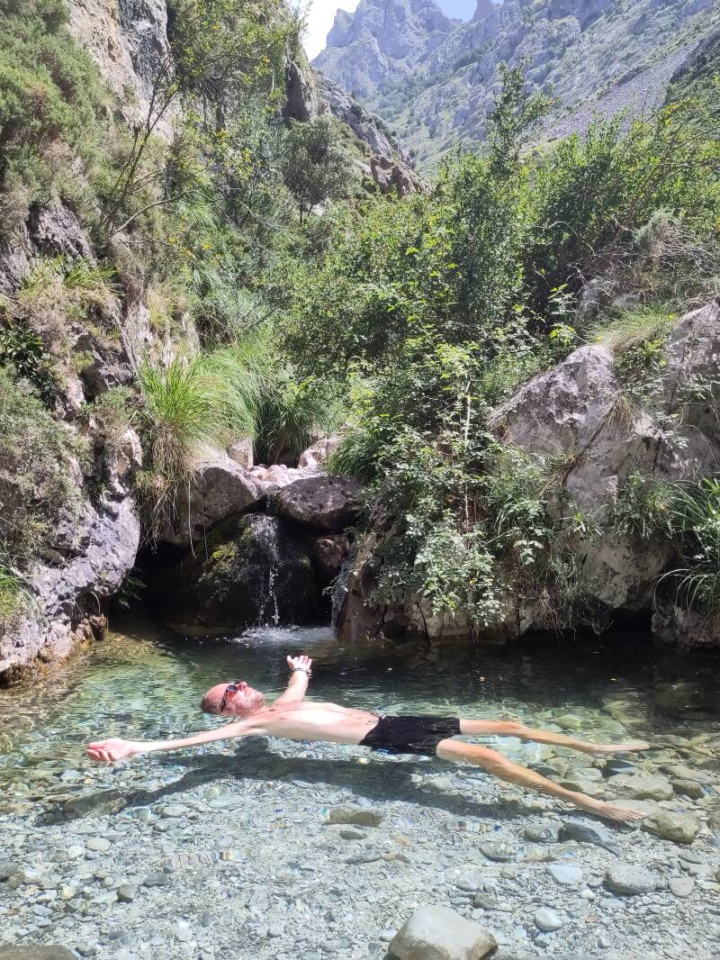 Een heerlijke plek waar ik in de ochtend yoga doe, Maarten (fit!) Wim Hof training doet met de ijskoude waterval als ijsbad en de kinderen heerlijk over de camping struinen en vriendjes maken. We vallen met onze neus in de boter met een leuk festival op de camping vol met prachtige muziek en leuke kraampjes met lokale producten en sieraden. Ik maak deze reis ook om mijn grenzen te verleggen op meerdere vlakken en hier ligt zomaar een kans voor mijn neus om een uitdaging aan te gaan. Vlak voor vertrek heb ik geleerd armbandjes te maken met edelstenen. En op reis heb ik er inmiddels een aantal gemaakt. Dit is dé kans om ze te 'presenteren'. Ik verzamel moed en vraag of ik me bij de rij kraampjes mag voegen en dat wordt enthousiast ontvangen. Mezelf op deze manier bloot geven, mijn eigen werk aan de buiten wereld presenteren en daar dan geld voor vragen vind ik super spannend. Maar ik doe het. En het is leuk! Ik heb super leuke gesprekken, de armbandjes worden enthousiast ontvangen en ik verkoop. En de camping eigenaar vraagt of ik mijn armbandjes in zijn winkel wil neerleggen om te verkopen. Ik ben 'De Alchemist' weer aan het lezen en het voelt weer bewezen dat het universum je beloont als je de juiste koers vaart. En dat kon ik even gebruiken. Het zijn hele kleine stapjes die we eigenlijk alle vier zetten en tussendoor dwalen we soms groot af, maar als we dan even in de stroom zwemmen (de Cares op de foto), dan voelt dat heerlijk!