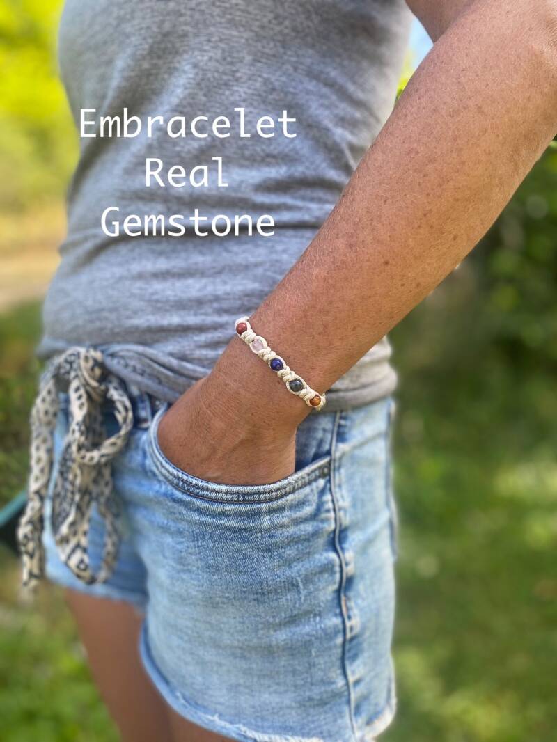 Je weet wel, zo’n winkeltje dat naar wierook ruikt en waar allerlei kleurrijks en mystieks is te vinden. Ik was nog nooit zo’n winkel binnen gewandeld. Te spannend? Ik zag prachtige stenen en kocht er een voor Maarten. Maarten had toen in Duitsland een eigen bedrijf, werkte ontzettend hard en onder hoge druk. Thuis lag hij wel eens met hartkloppingen op de bank. Zo ook toen ik thuiskwam uit Breda. Instinctief legde ik de steen op zijn hart en onmiddellijk stopte de hartkloppingen. Als ik al twijfelde aan de kracht van stenen, hier werd voor mij de helende werking bewezen. En sindsdien ben ik dol op stenen. Stenen omarmen je, ‘they embrace you’, zo voel ik het. Ik was super blij om te leren er armbanden van te maken. Tijdens onze reis verkoop ik de Embracelets live, maar de vraag naar online kwam (thanks Manonie!) en vandaar mijn webshop met armbanden voor mannen, vrouwen en kinderen. Wie weet vind je iets leuks voor jezelf of als cadeau. En oh ja de steen van Maarten was een Rhodochrosiet en hij zit nog elke dag in zijn broekzak.